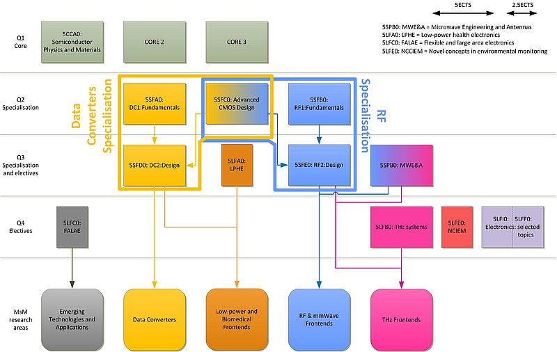 The course Advanced CMOS is central in the spcialization program of the IC gourp. It is required for the two main tracks: the data-converters and the RF electronics. The schema of IC gorup specialization and the position of the Advanced CMOS design course an be seen in the following scheme: