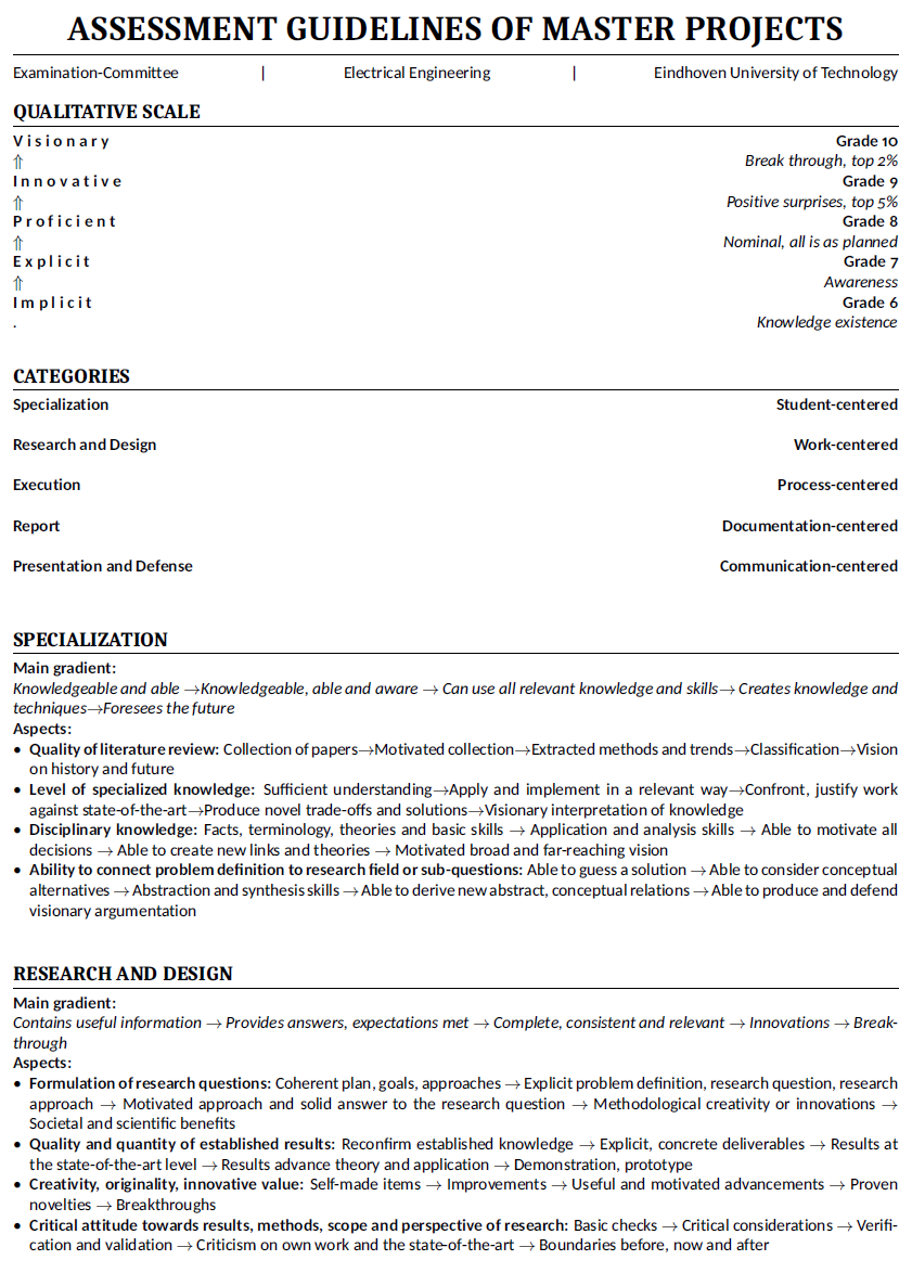 The TU/e regulations and procedures and all supporting documents of the final Master project can be found on this link. The following information concerns the guidelines for the project evaluation. It is for both the students and the evaluators.