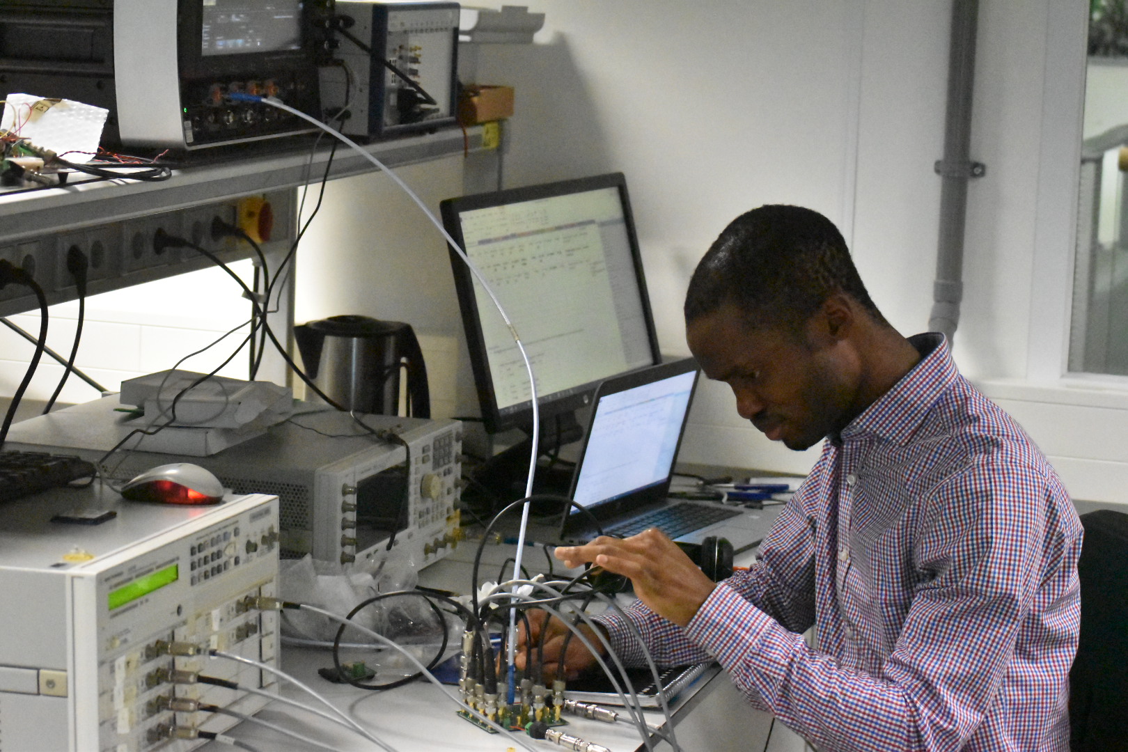 Stijn made a PMCW demonstrator for his BEP project JS Cimulator Georgi gave a webinar for MDPI Adedayo is measuring his first test chip Pavlos and Marios took part in the 5G meeting Qilong Liu presented the main concepts of our PERFECT SDM project at ProRisc 2019! Successful graduation of our top Master student Stefan! 5G AD/DA We attended the annual user committee meeting of the STW-NXP Partnership program "Advanced 5G Solutions"! New youtube video by Qilong Liu! Successful graduation of our top Master students Daan and Fatima! A new video on PN junction! Better video quality.